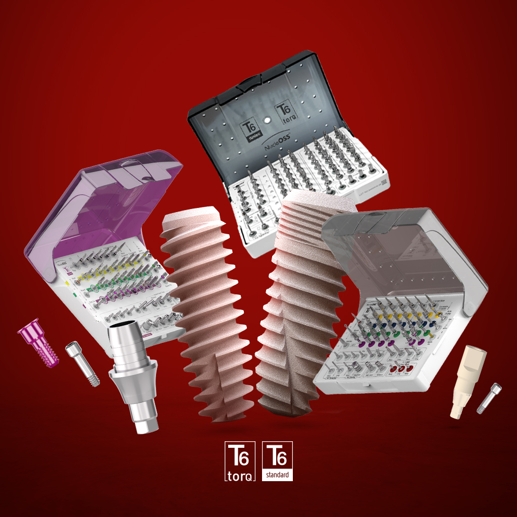 The system features two main lines: T6 Standard and T6 TorQ, offering a total of 44 implant sizes.